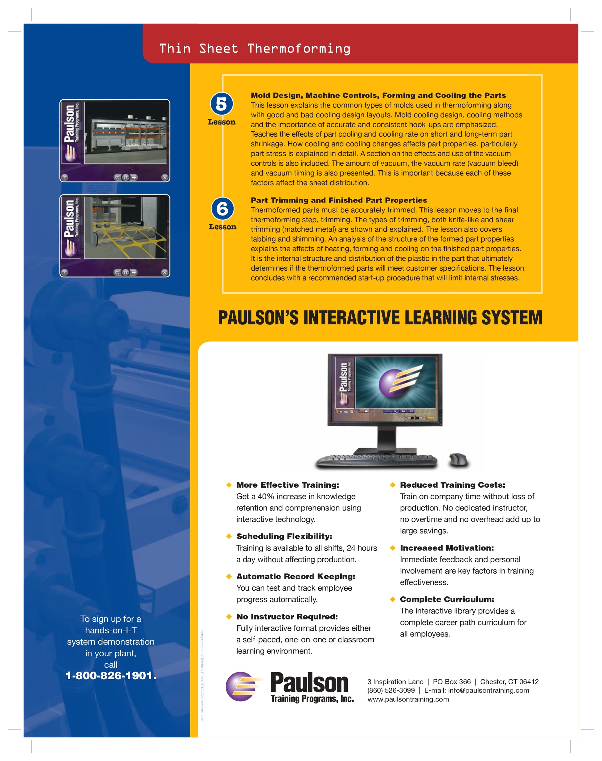 Your employees will get an overview and understanding of the thermoforming process and operation of the machinery used in thermoforming, the function of each component of the thermoforming line, plastic behavior during the thermoforming process, sheet extrusion fundamentals, optimizing operating controls, safety around the thermoforming machinery and thermoforming for maximum efficiency and profit.